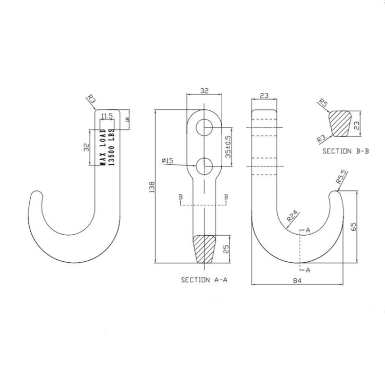 Ini cangkuk menunda dibina dari keluli tahan karat tinggi, dirawat haba, yang dipalsukan untuk kekuatan maksimum. Ia dinilai untuk 10,000 lbs. (terhad kepada struktur pemasangan)